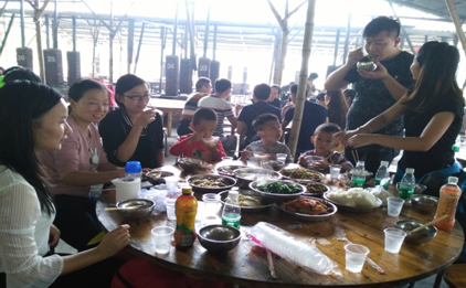 一起分享集體協(xié)作的成果,雞,魚,蝦,排骨等等,對(duì)了,還有餃子,像魔法一樣呈現(xiàn)在大家面前,話不多說,趕緊大快朵頤,下午還有更精彩的行程等著我們!