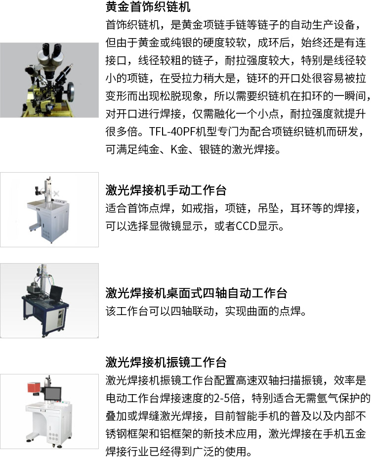 通發(fā)激光研發(fā)針配合黃金織鏈機、K金制鏈機、首飾制鏈機的TFL-80PF自動激光焊接機,焊接機采用能量反饋技術,光點穩(wěn)定,能量強勁,實現(xiàn)一環(huán)一焊的功能,確保金鏈的耐拉強度。本激光焊機實現(xiàn)了水冷一體的小型化結(jié)構。適用于各種生產(chǎn)場所。
