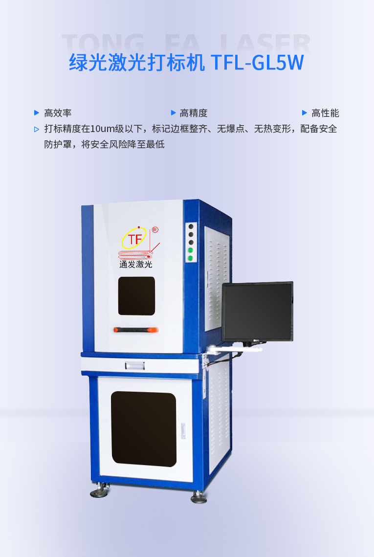 通發(fā)激光研發(fā)的TFL-GL3W/5W 綠光激光打標(biāo)機(jī)配備安全防護(hù)罩,避免設(shè)備操作員誤操作引起的人身傷害,將安全風(fēng)險降至最低,產(chǎn)品遠(yuǎn)銷海內(nèi)外.打標(biāo)精度在10μm級以下,標(biāo)記邊框整齊、無爆點(diǎn)、無熱變形,有效提高加工的成品合格率,使用壽命長、配合全封密光路、特別加固的光路底座滿足長期、穩(wěn)定性的工作需要。