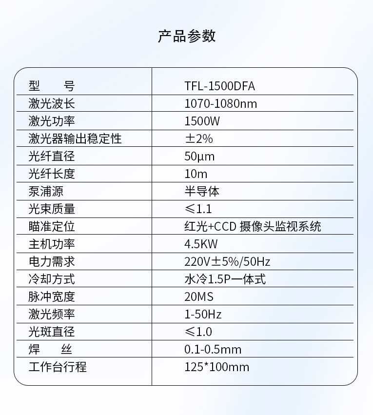 采用光纖激光器,反射率高,能量強(qiáng),免維護(hù),免調(diào)光,功耗少,相比傳統(tǒng) 模具焊來(lái)說(shuō),安全,穩(wěn)定性好超長(zhǎng)使用壽命。 1500W光纖激光器,滿足銅、鋁焊接量大的模具及產(chǎn)品焊接加工需要。 高承重底座及工作臺(tái),保持輕便靈活的優(yōu)點(diǎn),同時(shí)提供更高承載能力。 配備.1.5P大功率一體式水冷水機(jī),保證了大功率焊接的穩(wěn)定性。