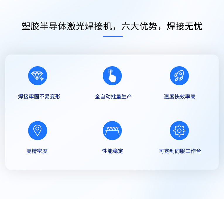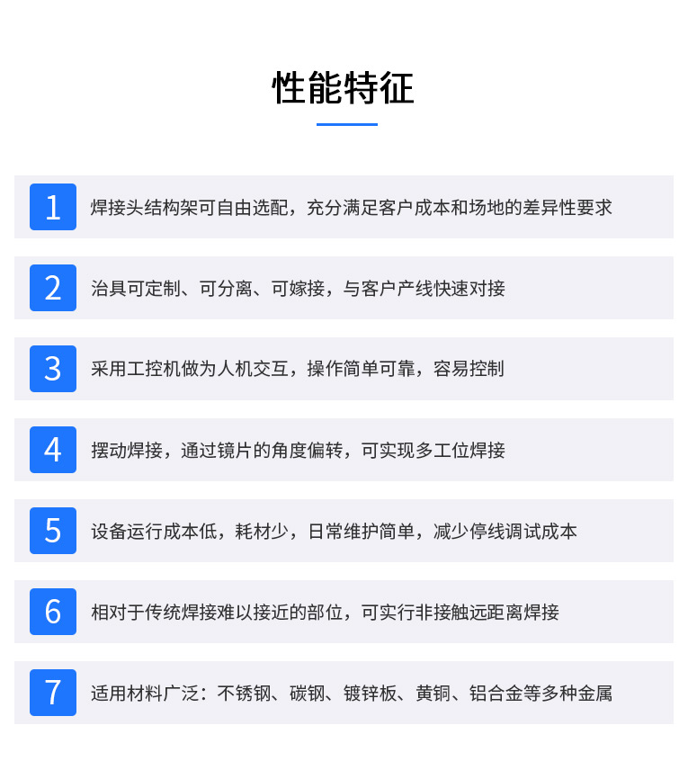 加工頭:激光頭可實現(xiàn)±60度旋轉(zhuǎn),效率高,可實現(xiàn)產(chǎn)品多角度焊接,適用性強。